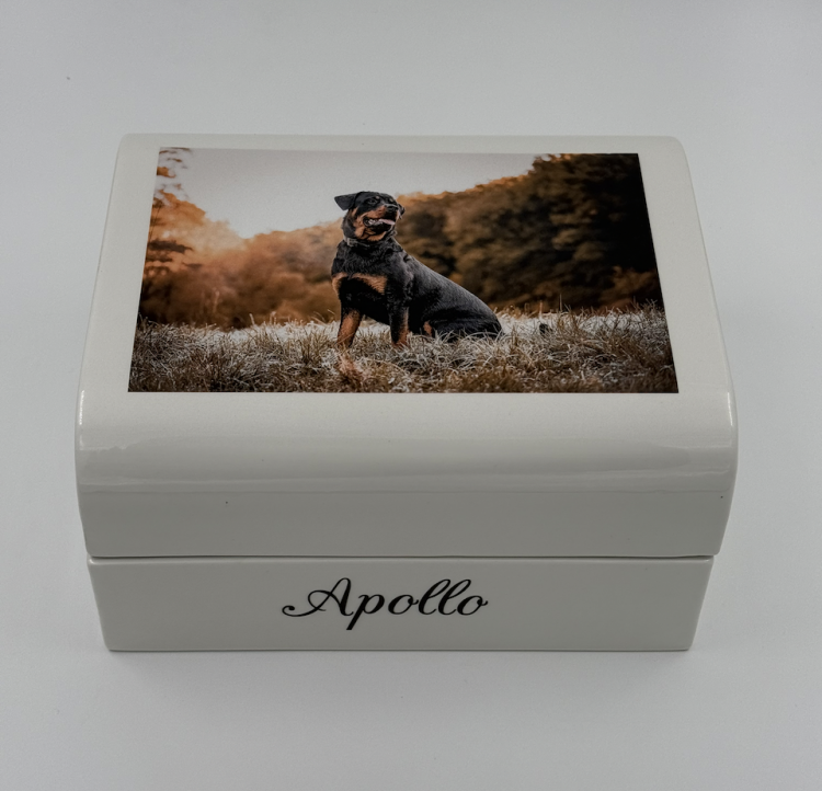 M3 - Cofanetto Carrara con porta fotografia calamitato, nome, date e zampette (stampa foto esclusa)
