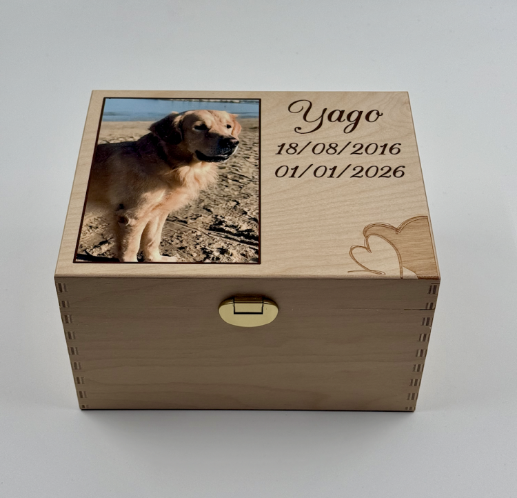 Descrizione: Astuccio in betulla naturale con incisione cuori, nome, foto e date
