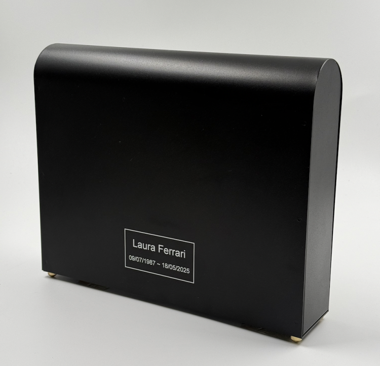 Descrizione: Urna libro di colore nero. Etichetta di identificazione con nome, cognome, data di nascita e data di morte posizionata sul retro dell’urna. Stampa professionale con ultravioletti.
