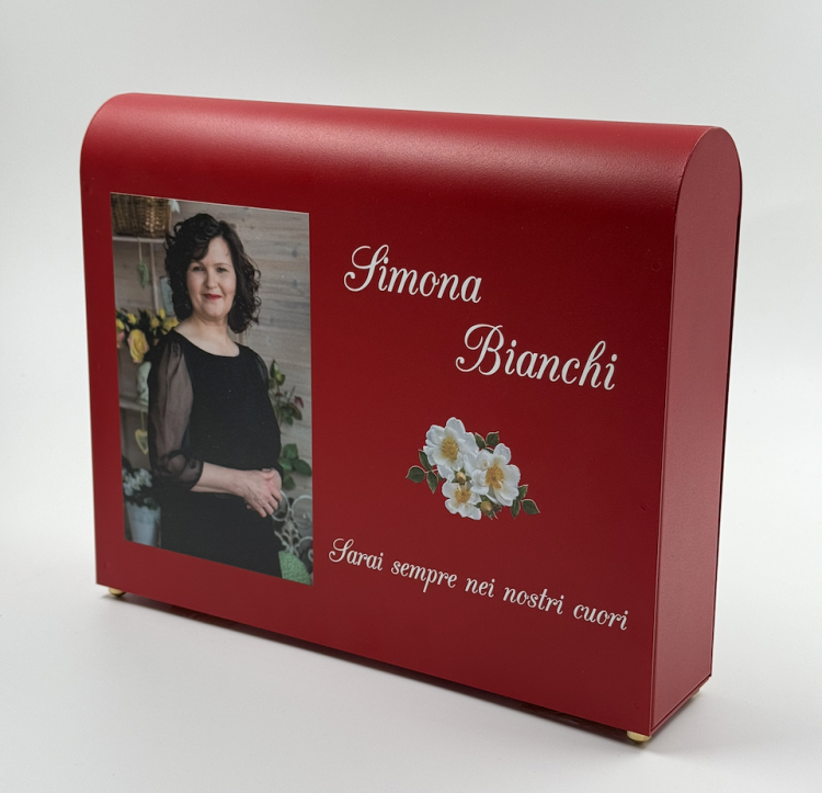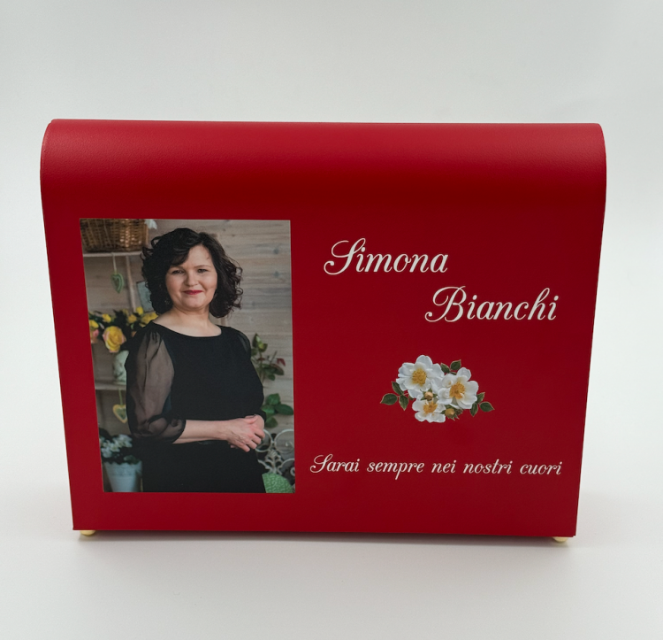 : Urna libro colore nero con foto, decoro e frase commemorativa. Stampa professionale ad ultravioletti.